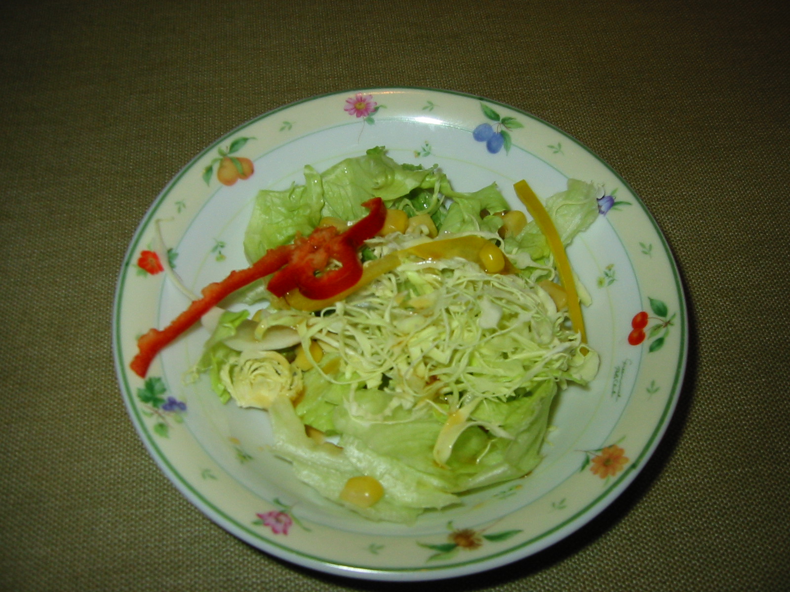 次も期間限定商品のバーベキューフォカッチャです。写真はサラダセットです。グリーンサラダとスープ又はドリンクがつきます。写真はコーンスープです。価格はセットで700円です。