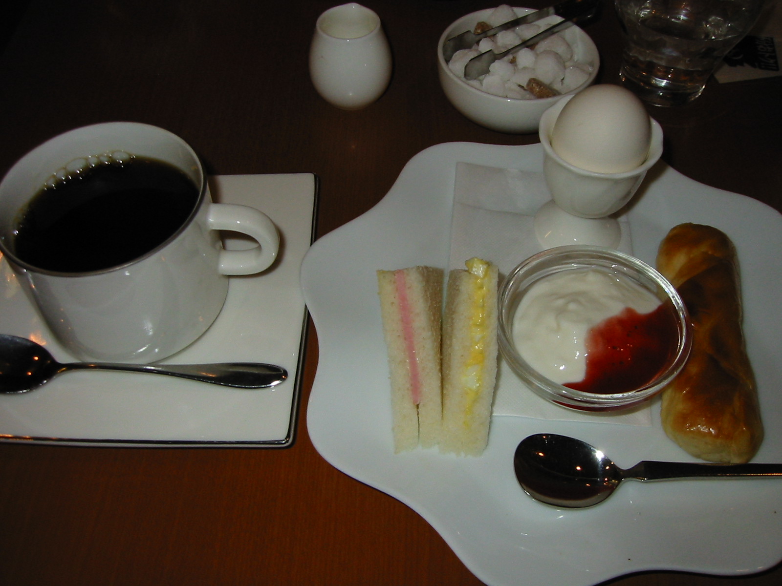 写真はモーニングセットです。399円で大変お得なモーニングです。サンドイッチと軽いパンとヨーグルトとゆで卵がついています。朝食抜きで行ってもOKですね。(^o^)