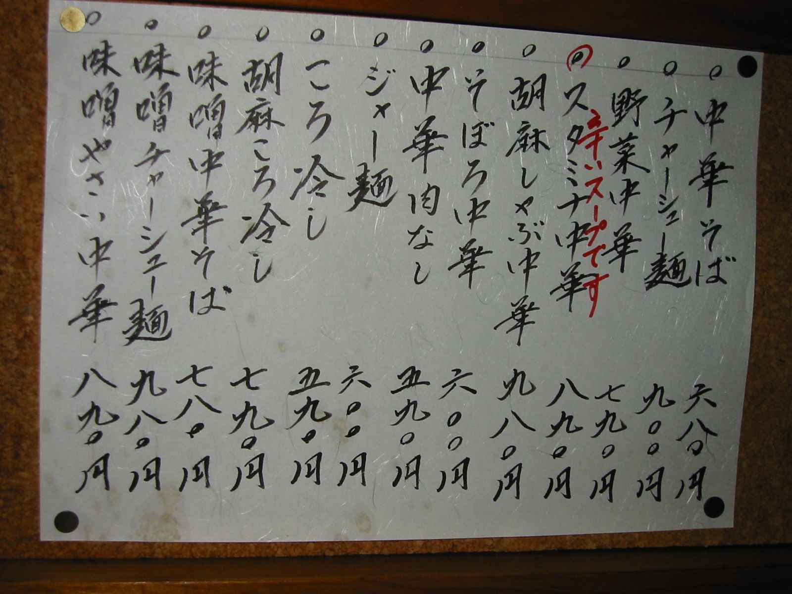 ときわさんのメニューです。(クリックすると大きくなります)中華そばだけでなくいろいろな中華そばがありますので食べてみてください。また夜はつまみ類のメニューも多くお酒も飲めます。