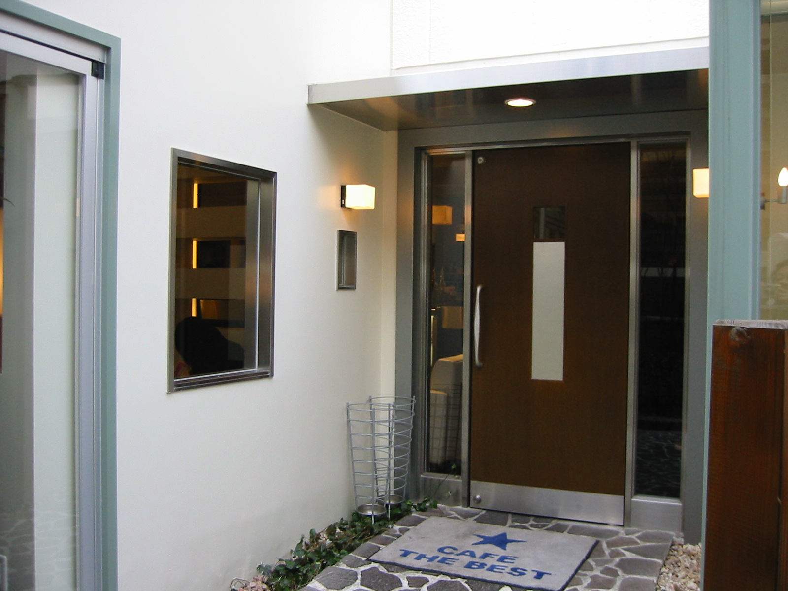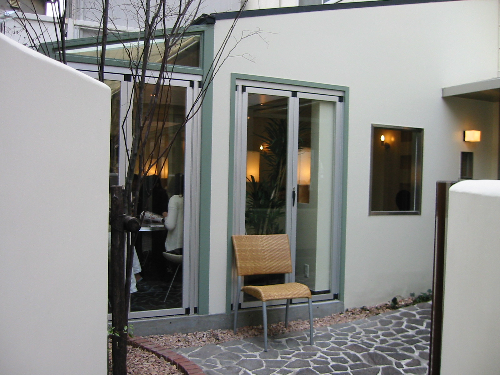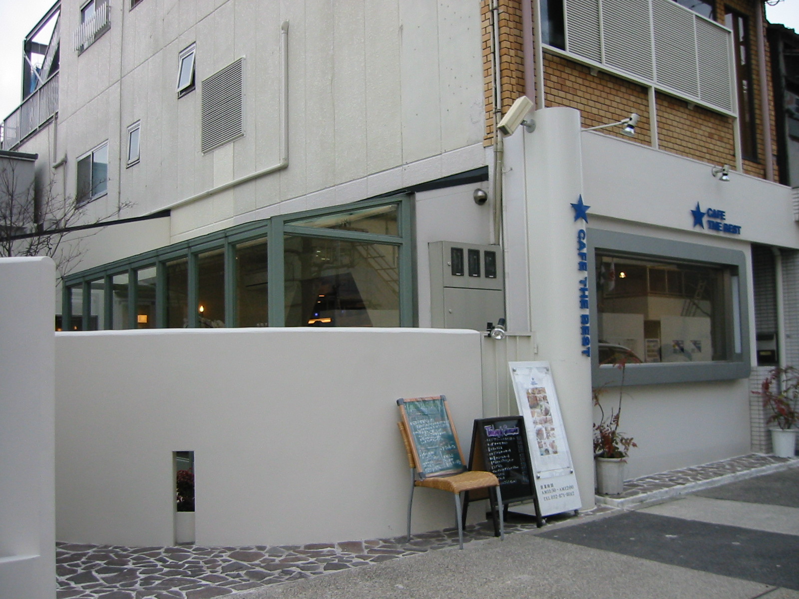 カフェ ザ ベストさんはアプローチが凝っています。白い壁を抜けると前にテラス風の席が見えてきます。(左の写真) そこを過ぎると入口です。(右の写真)ちょっとした時間ですが、おしゃれな異空間へのいざないを感じます。
