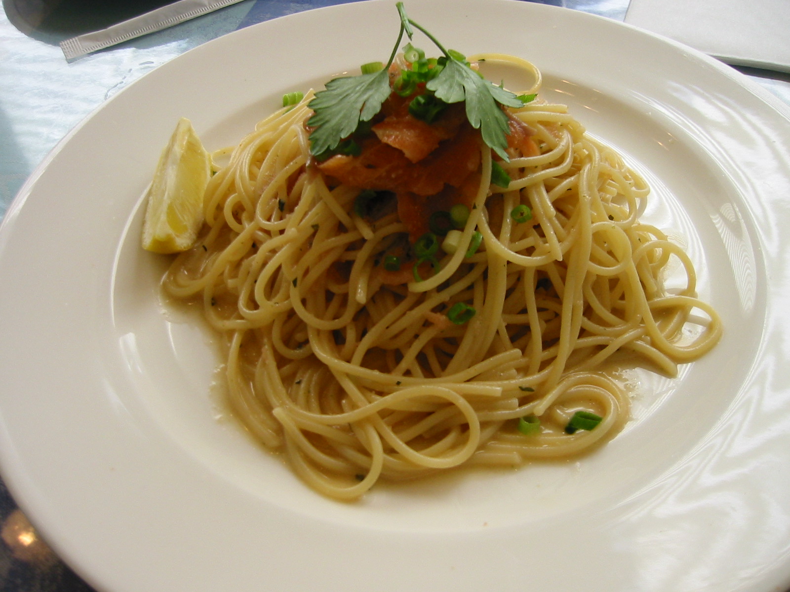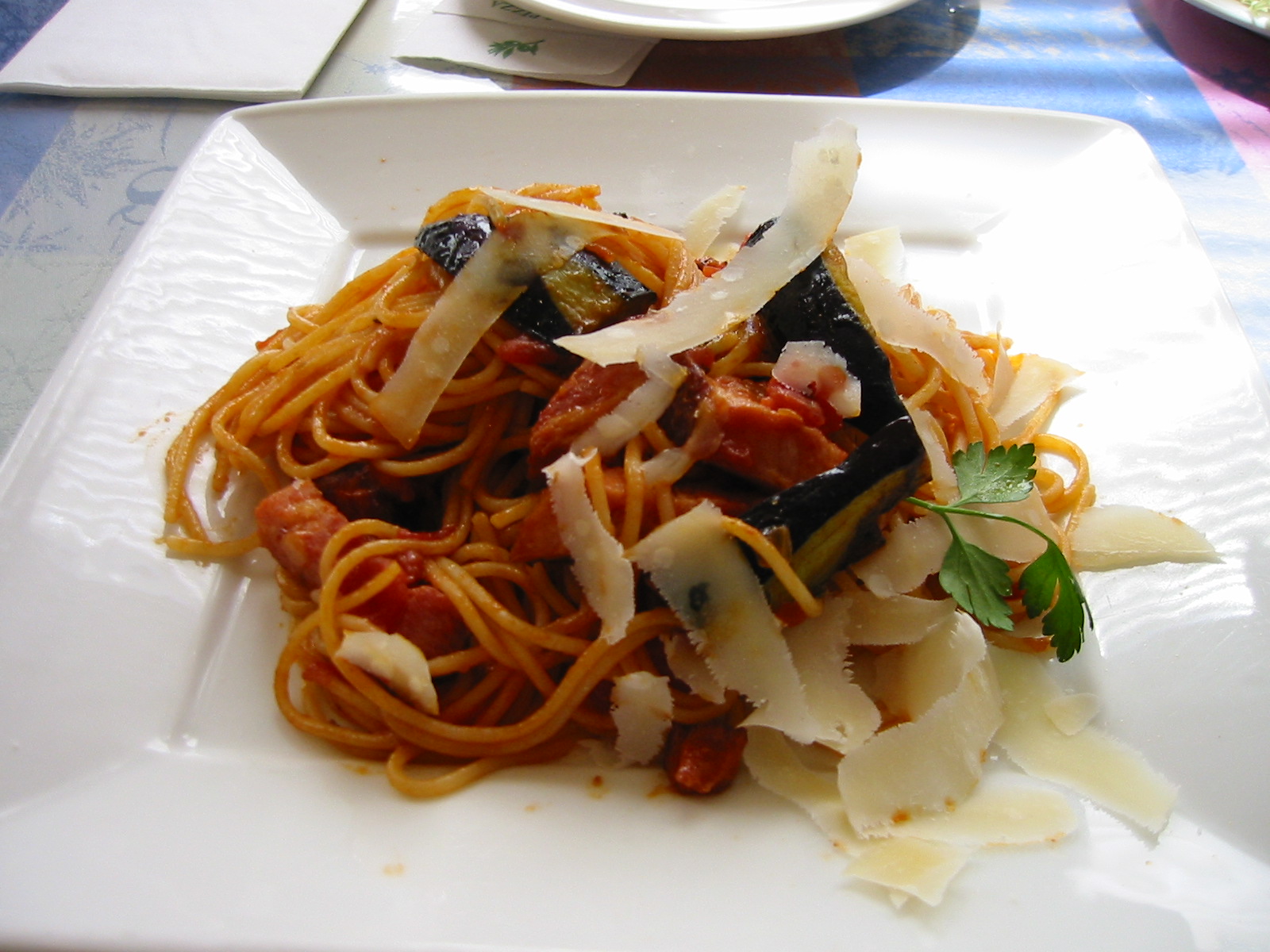 左は明太子とノルウエーサーモンのパスタです。価格は1580円です。右のパスタはメランツァーネ(ベーコンとなす)です。価格は1380円です。