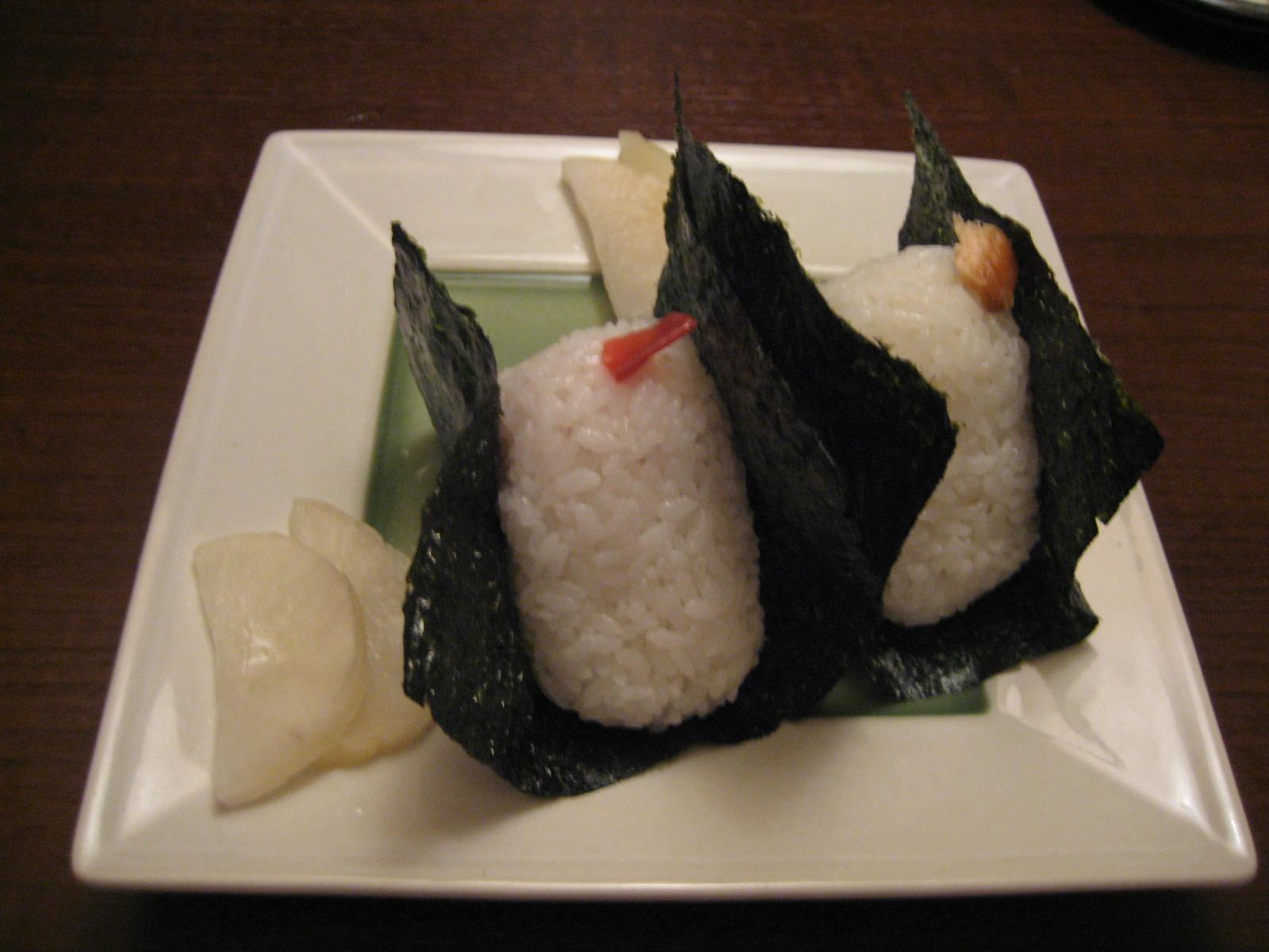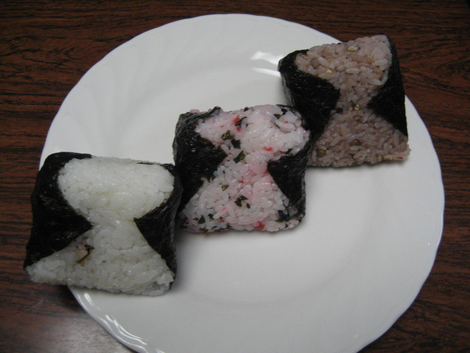 写真は、「多司」さんの大きなおにぎりとマスコットのおにぎりちゃんです。左からしぐれ、梅ワカメ、七穀飯です。価格は各105円です。大きくてリーズナブルなおにぎりです。