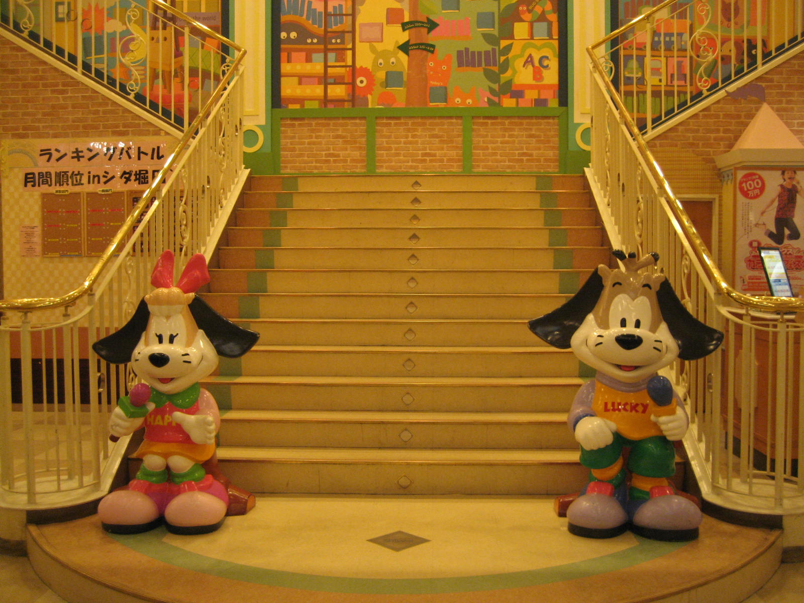「シダックス名古屋堀田クラブ」の店内です。2階への階段ですが、ゲームセンターのような雰囲気で、子供連れでも楽しめるようになっています。カラオケも家族皆で楽しむ時代になったようですね。