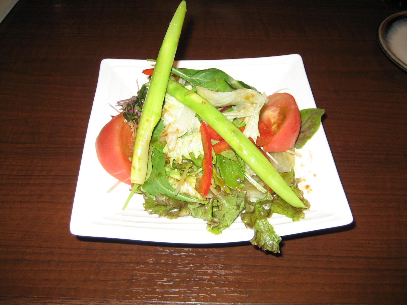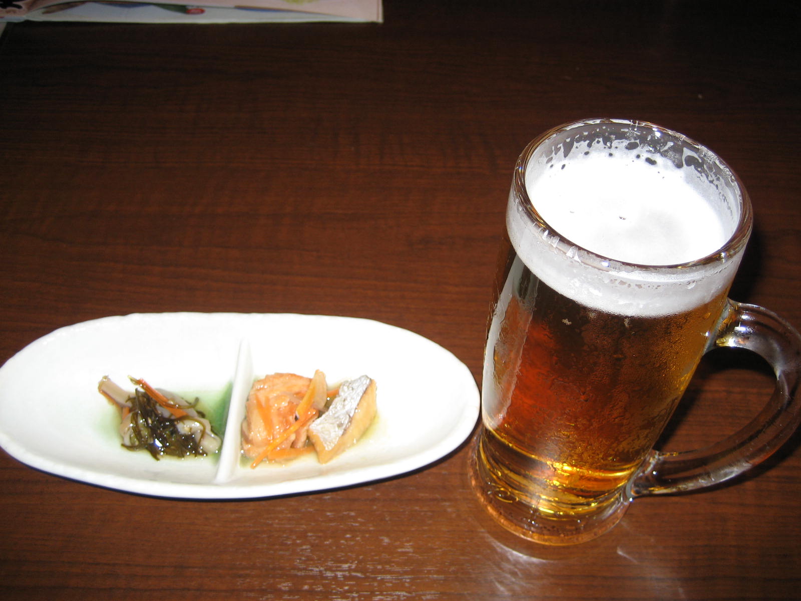 写真の左は生ビールとお通しです。価格は生ビールが399円です。右はグリーンサラダです。価格は390円です。サラダはボリュームがあってお値打ちです。