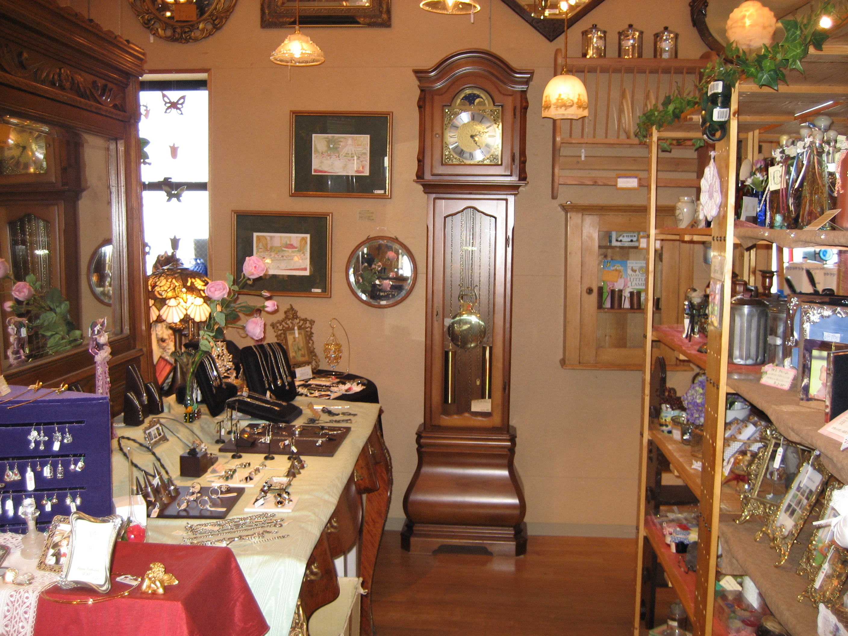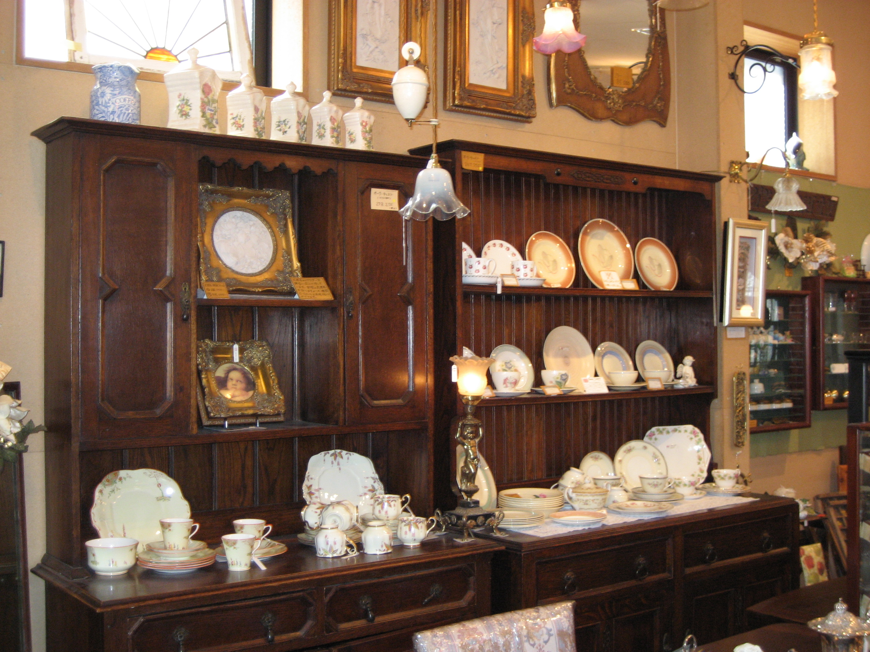アンティークの棚にはコーヒーポットやティーカップ等多くのアンティークスが並べられ、ゆっくりと商品を見ることができます。