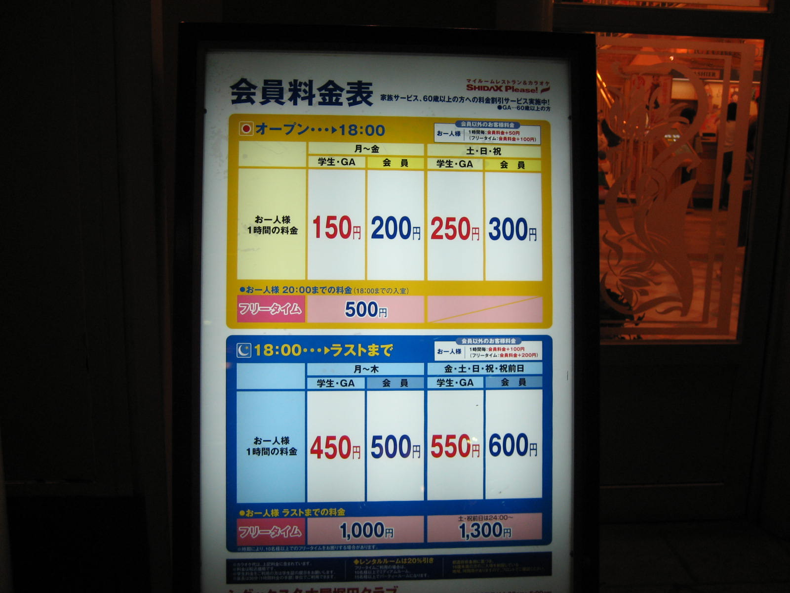 料金表です。1回利用すると翌月まで利用できるルーム料金20%OFF券がもらえます。カラオケ好きの人には利用し易いお店です。