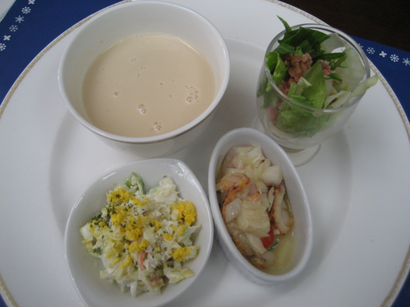 最初は、本日の「オードブル」です。カレー風味のソースが美味しい一品でした。その後は「ポタージュスープ」です。