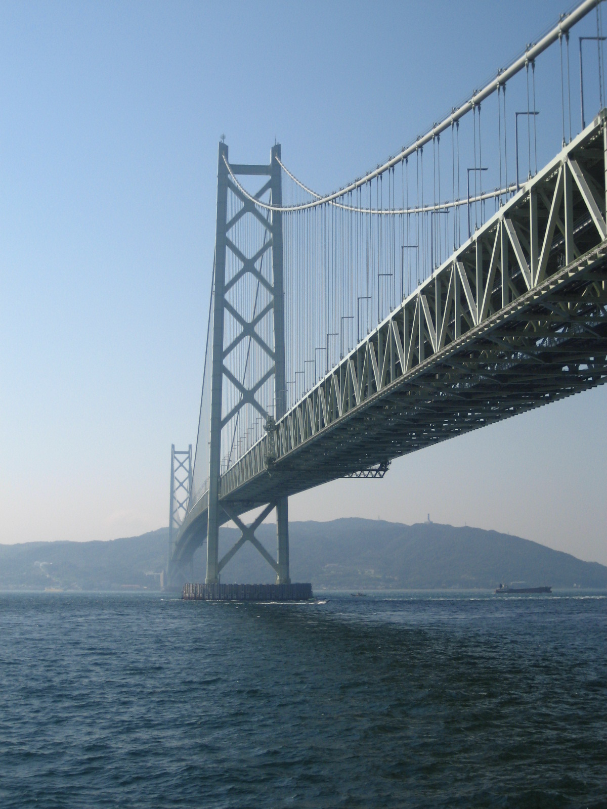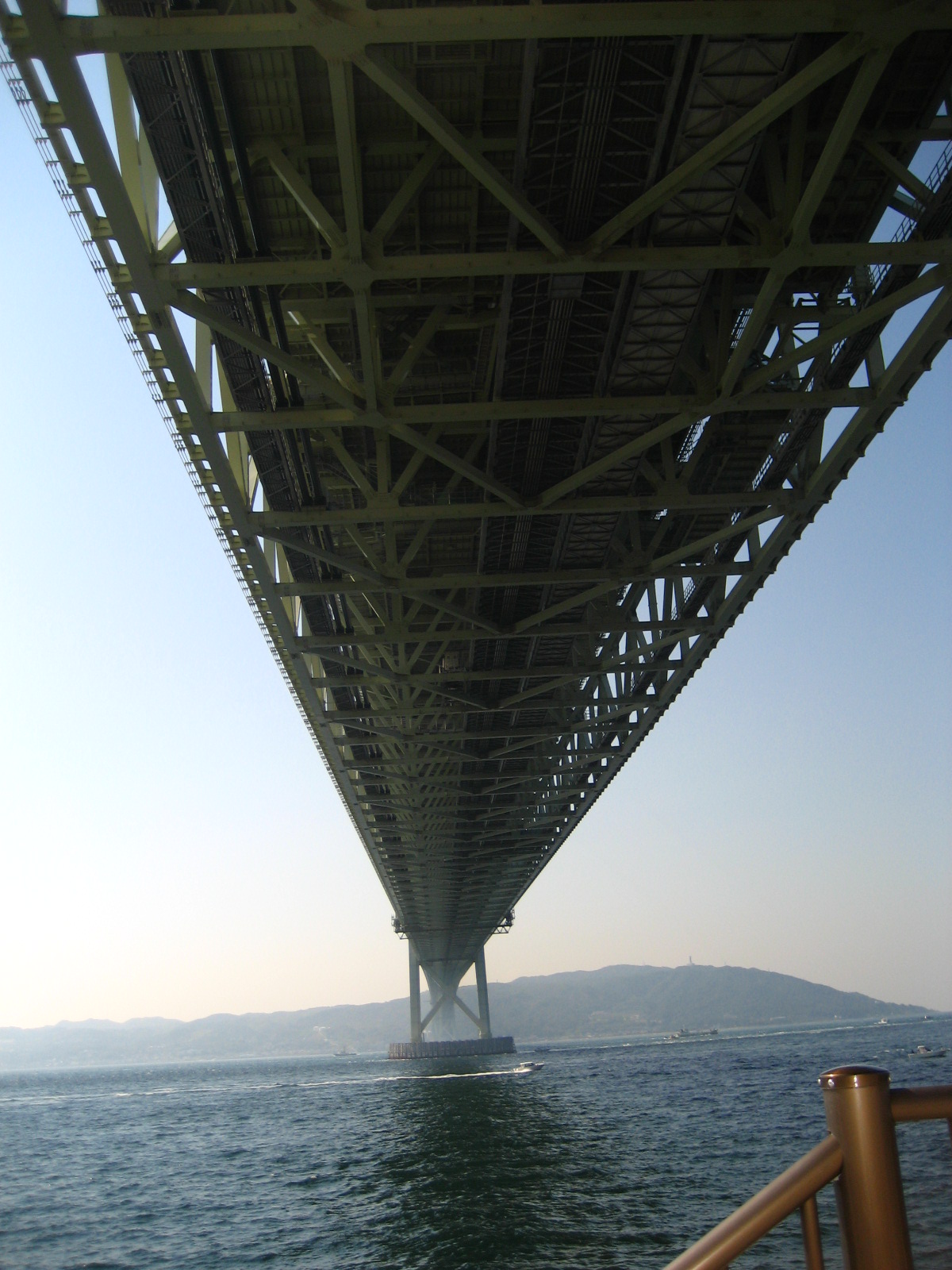 遠くまで続く鉄橋の写真です。これは、「明石海峡大橋」を真下から撮ったところです。淡路島まで伸びる直線が迫力があります。
