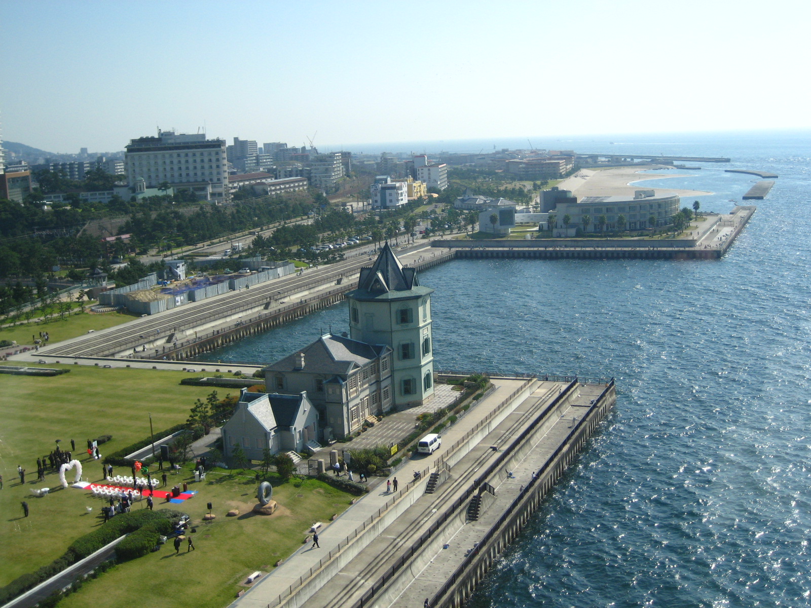 「明石海峡大橋」は世界一のつり橋で、その橋の海面から高さ約47m、陸地から約150m、明石海峡に突き出した回遊式の遊歩道があります。その「舞子海上プロムナード」から見たのが左の写真です。舞子公園から続く海岸線がきれいです。