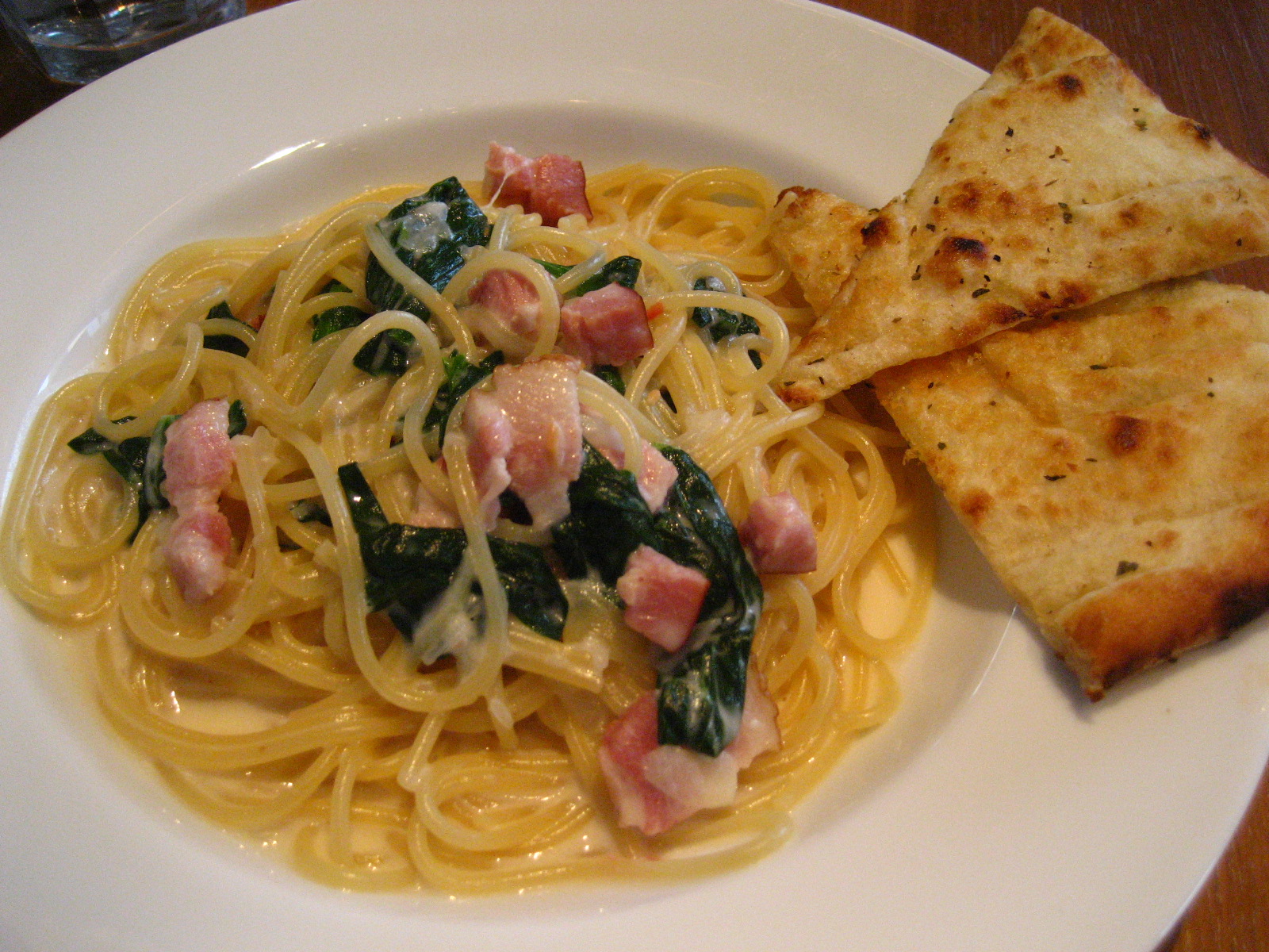 本日のパスタは、「ツナとキノコのトマトソース」と「ベーコンとホウレン草のクリームソース」です。パスタには、「窯焼きフォカッチャ」が付きます。