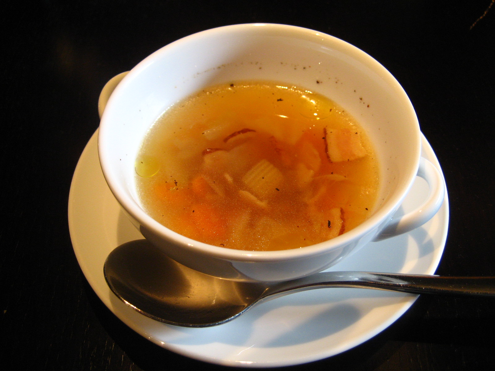 「サーモンを使ったサラダ仕立ての前菜」と「コンソメスープ」です。