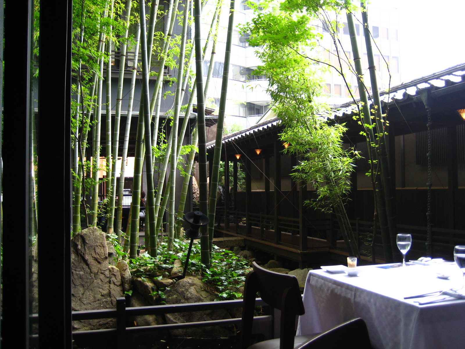 メインダイニングから見たお庭の様子です。孟宗竹が真っ直ぐ伸びていて緑がきれいなお庭です。