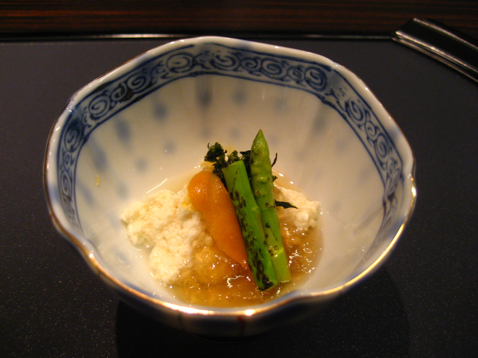 食前酒の「梅酒」と前菜の「豆腐、雲丹の旨出しジュレ掛け」です。
