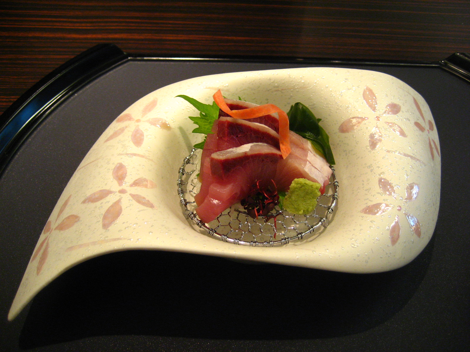 椀盛りは、「海老真丈、菜の花、新筍、柚子」で、向付けは「鰤の薄造り」です。