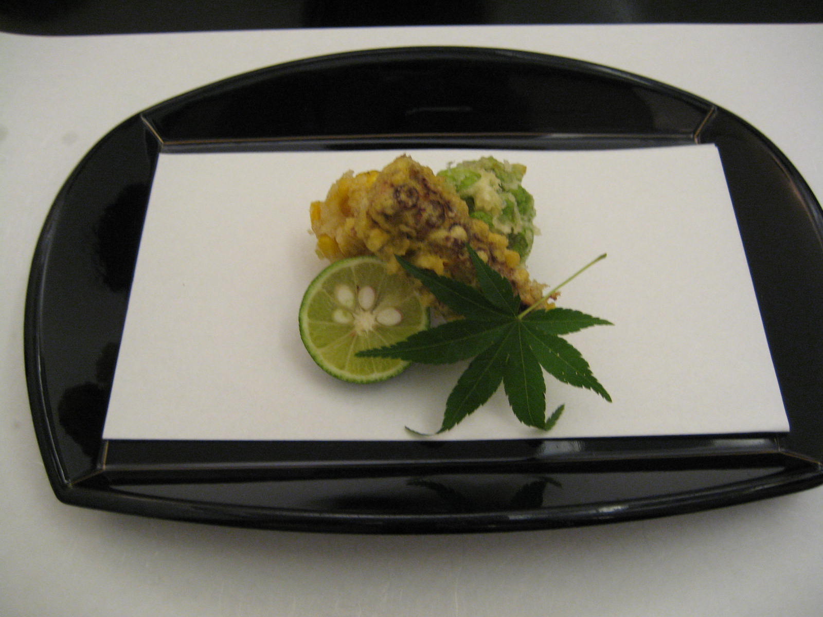 左はとこぶしと夏野菜のゼリー寄せです。とこぶしとゼリーの不思議な組合せが美味しい一品です。右はコーン等を使った揚げ物です。
