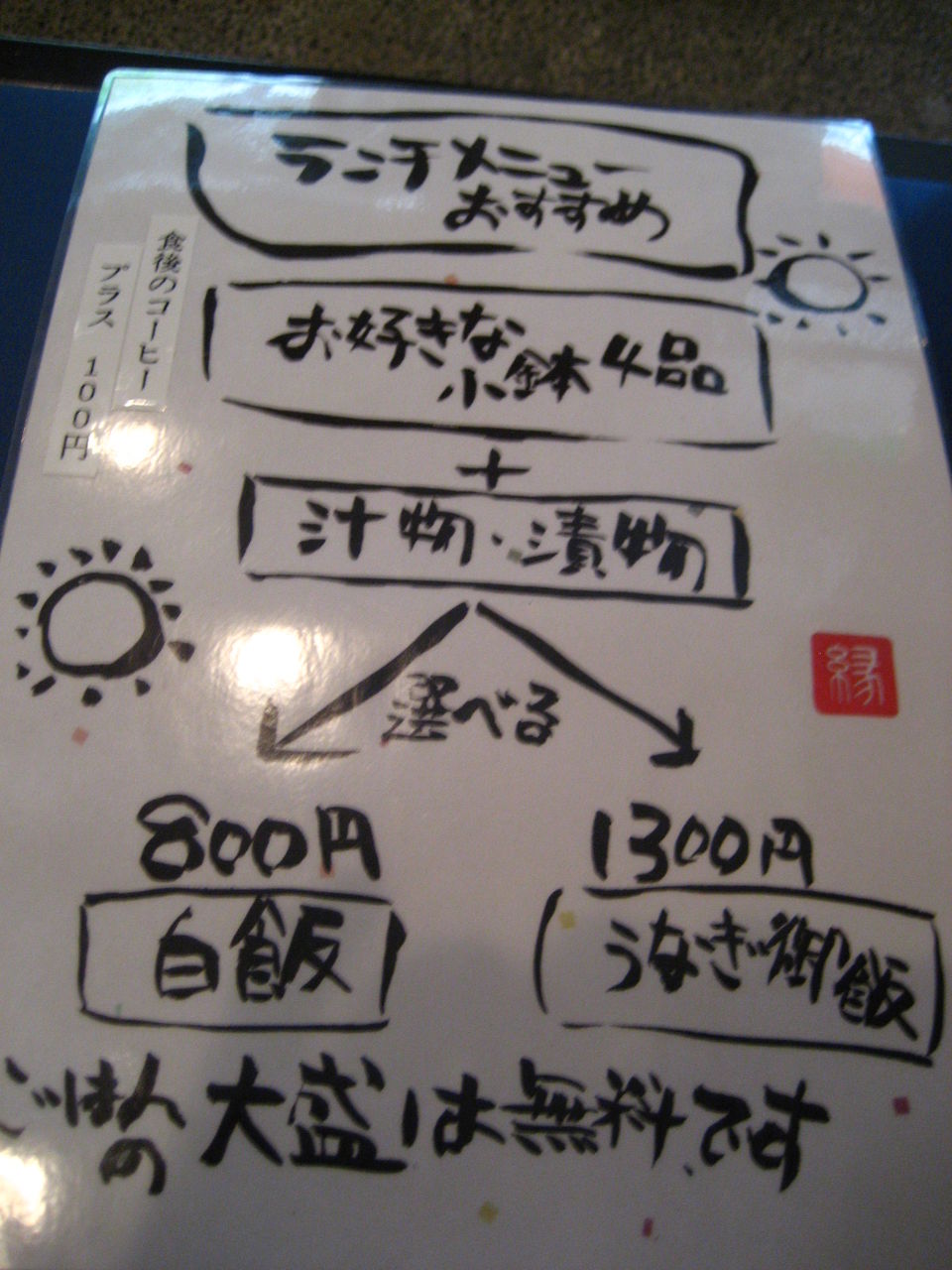 ランチメニューです。ランチはお値打ちでおばん菜の小鉢が4品選べる、楽しみなお店です。種類が多く、日によって選ぶ物を変えることも出来ます。白飯とうなぎご飯が選べて価格も違います。