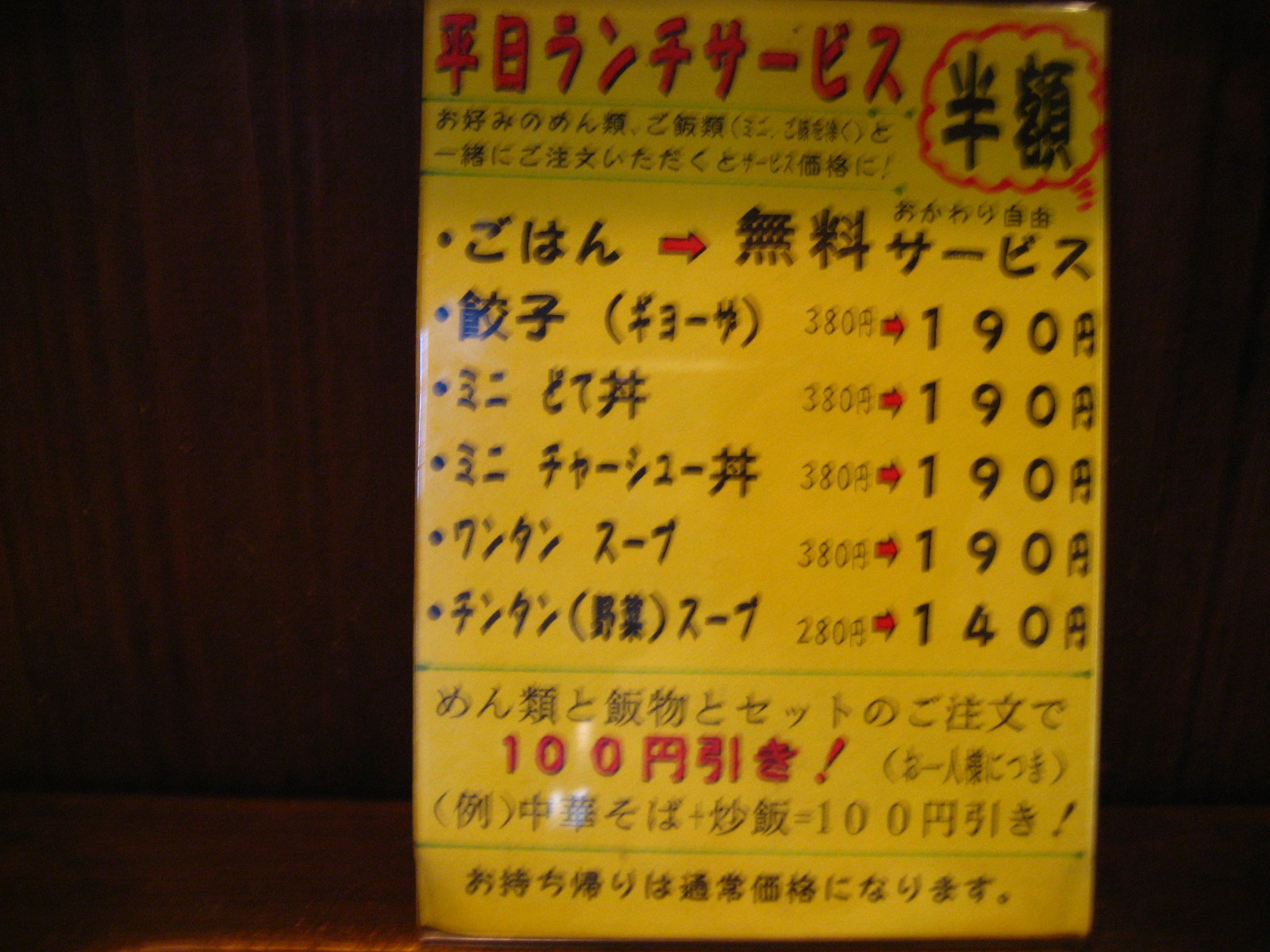 平日のランチサービスは、ご飯が無料で、餃子などの半額サービスがあるのでお得だと思います。チャーハンも美味しいお店のようなので次回は挑戦したいと思います。