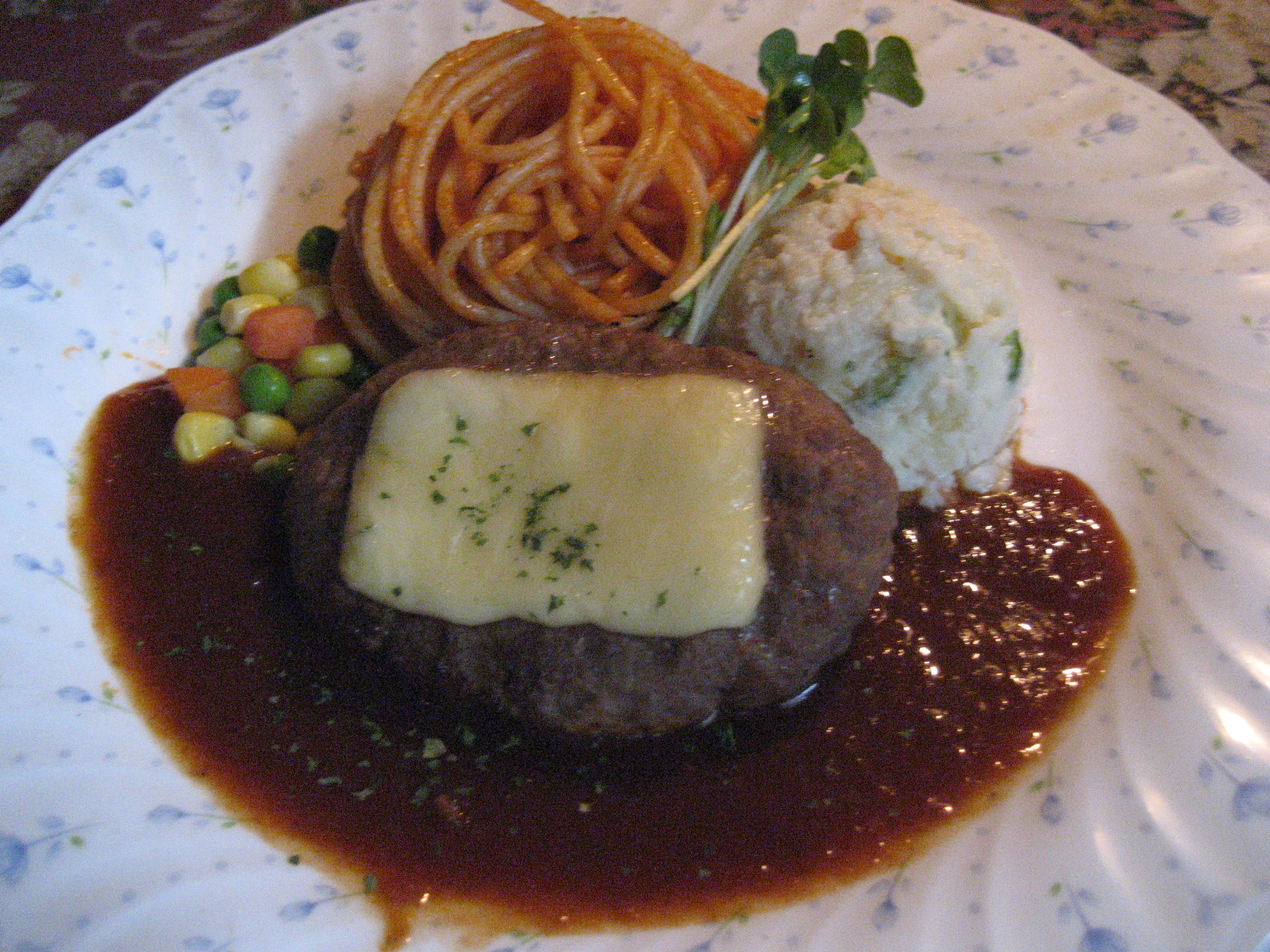左は、日替わりメニューの「チーズのせハンバーグ」です。