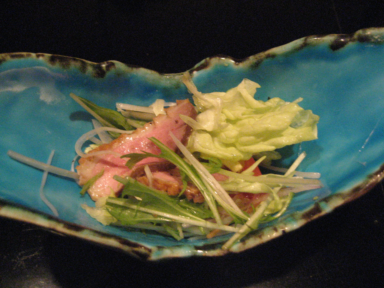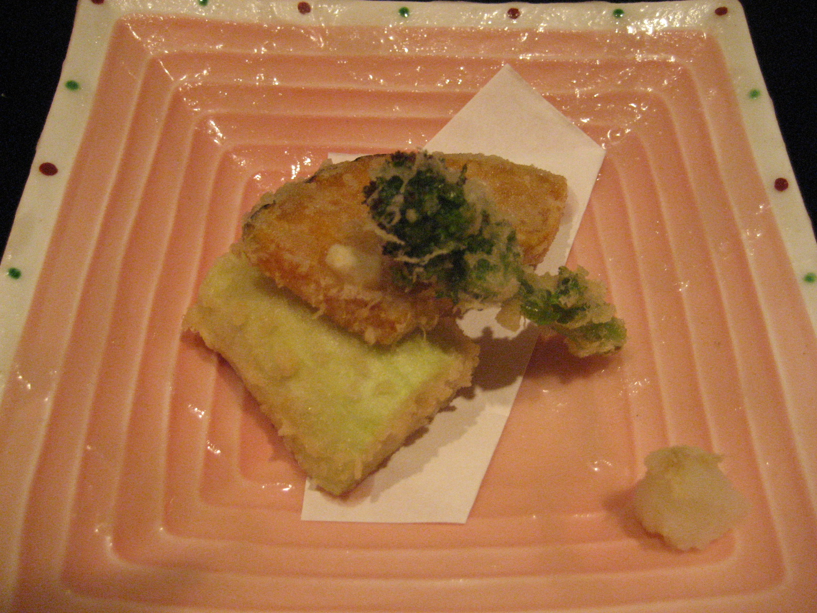 写真はディナーの上天麩羅の1皿目です。アスパラ、むかご、ふきのとう、生かき、海老の天ぷらです。サクッとしてあっさりした天ぷらは大変食べやすいです。