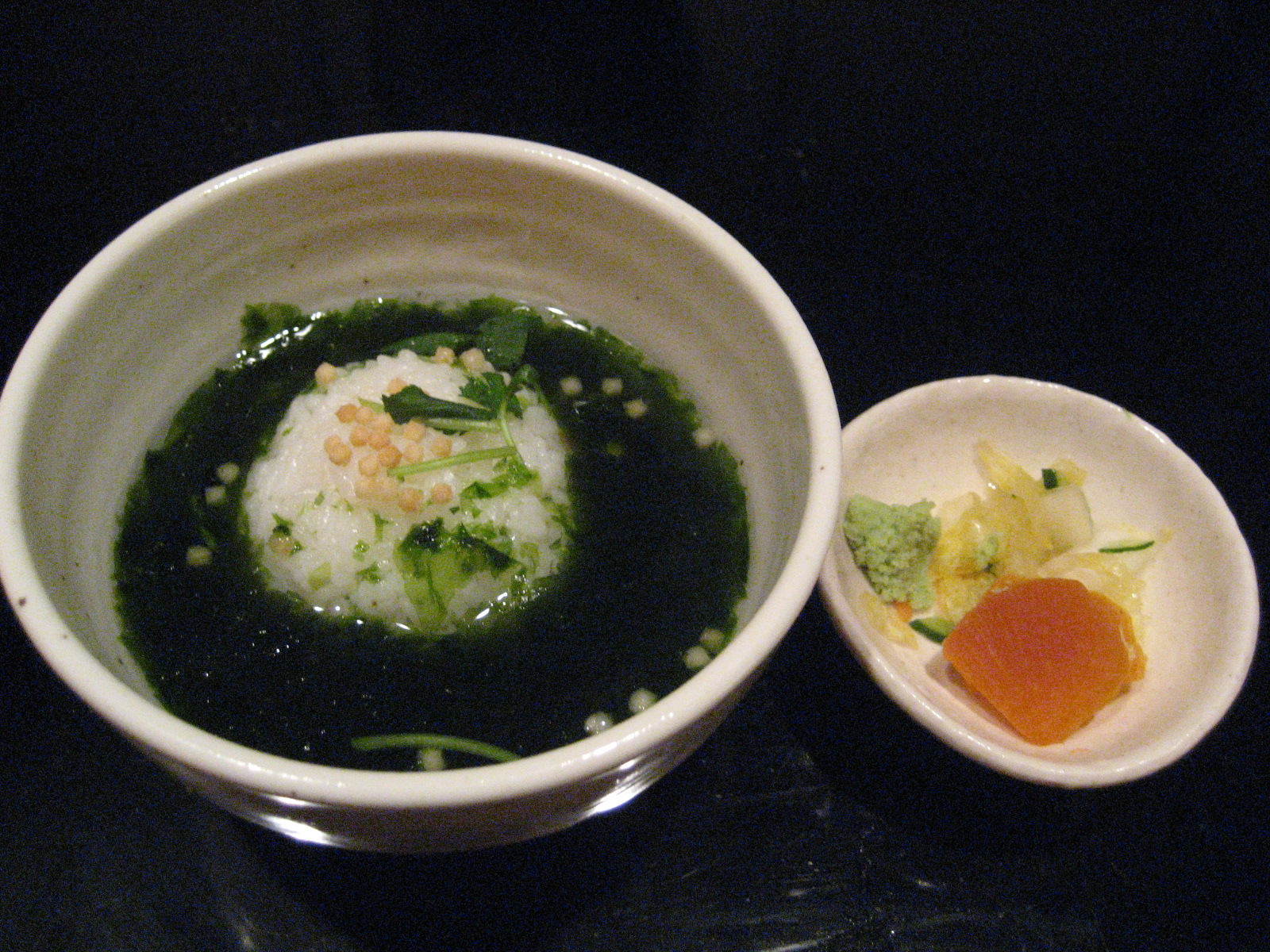 2番目の天ぷらは、「車えびとたらば蟹と貝柱の天ぷら」です。食事は、「青海苔のお茶漬けと漬物」です。