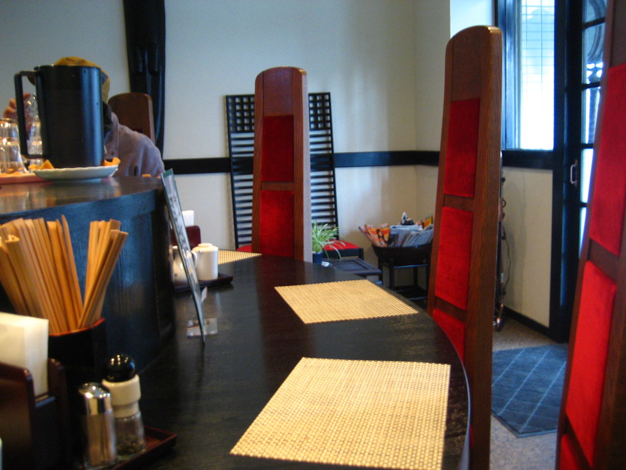 店内は、U字型のカウンターに赤い背の椅子が並んでいて、新しい感覚のラーメン屋さんです。女性にも好かれる雰囲気のお店だと思います。