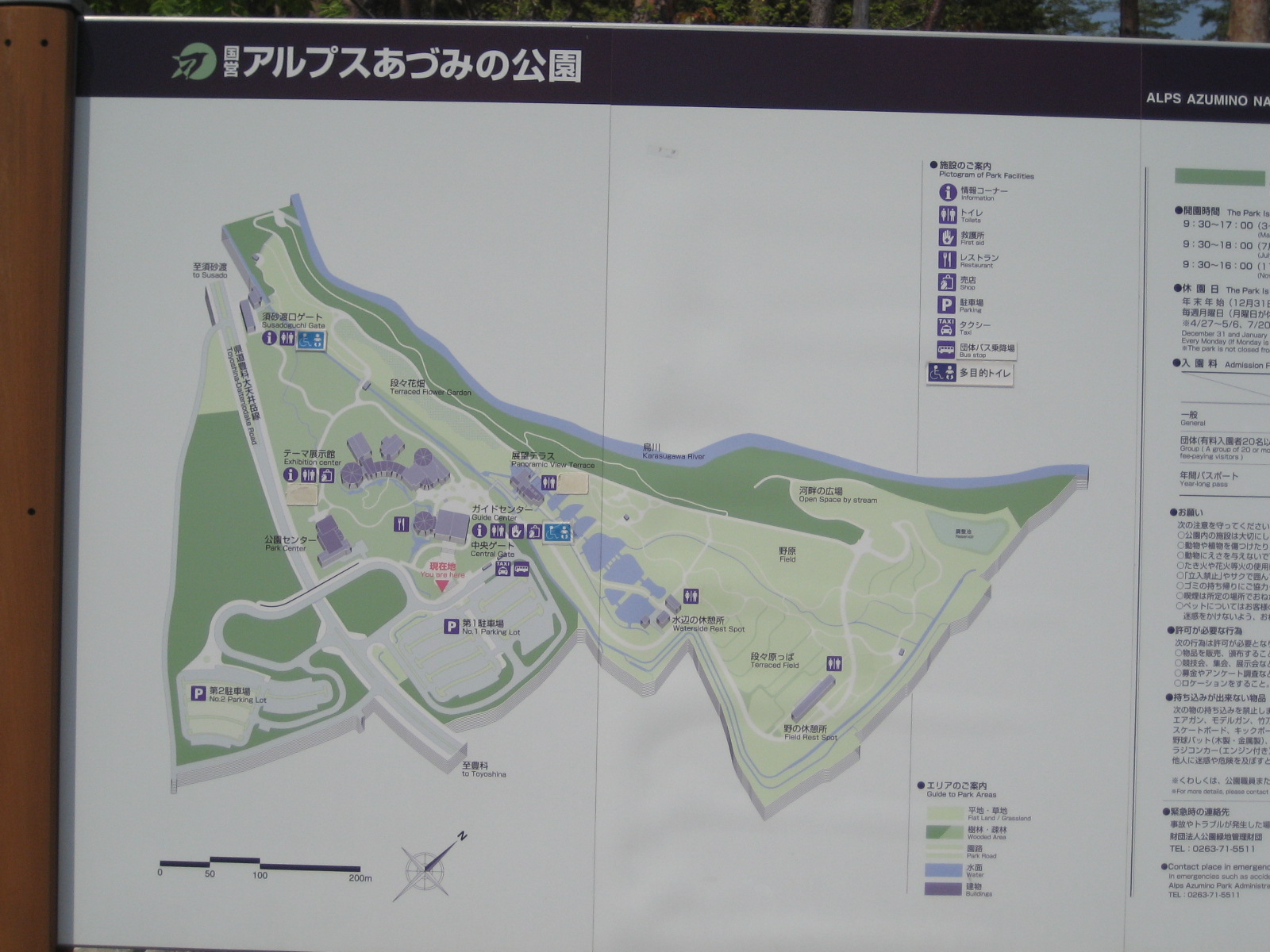写真は「アルプスあづみの公園マップ」です。(クリックすると大きくなります)常念岳が良く見える場所があります。駐車場は約700台置けます。