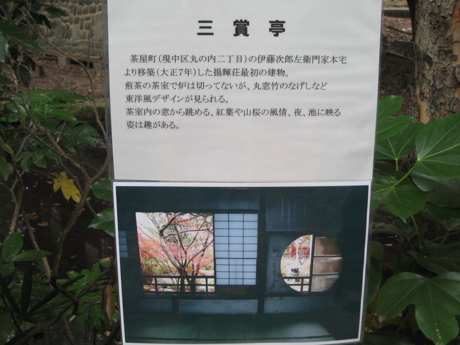 「三賞亭」です。煎茶の茶室を大正7年に移築したそうです。説明はクリックすると大きくなります。
