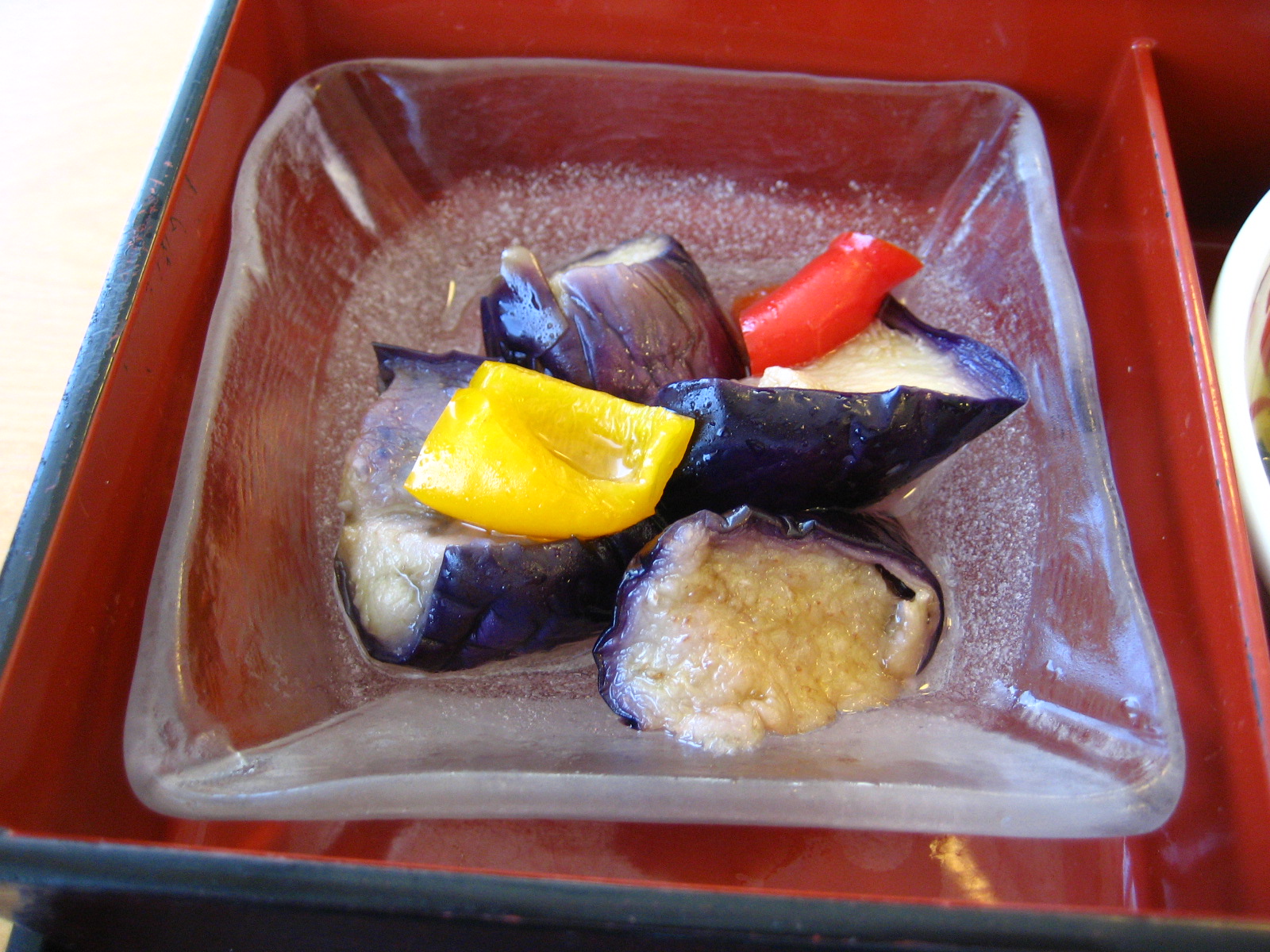 写真の左は、「揚げ茄子とパプリカの酢の物」、右は「大根とほたての煮物」です。