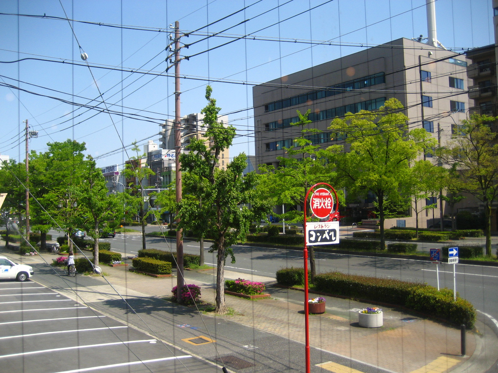 「コンパル御器所店」さんの店内は、レトロな雰囲気で昭和好きには落ち着くお店です。店内から外を見るとすっかり緑がきれいな季節になっていました。